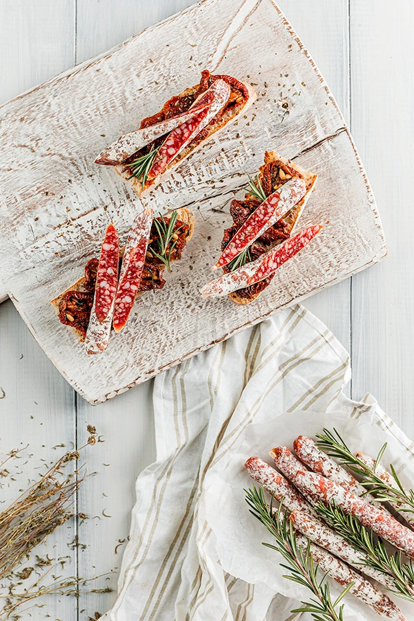 Mod de preparare: Taie bagheta Happy Bakers felii, stropește cu puțin ulei de măsline și prăjește-le pe tavă, până devin bine rumenite pe ambele părți. Așează feliile de baghetă pe un platou apoi adaugă roșiile uscate și Cârnăciorii Sicilieni tăiați pe orizontală. Decorează cu câte o crenguță de rozmarin.